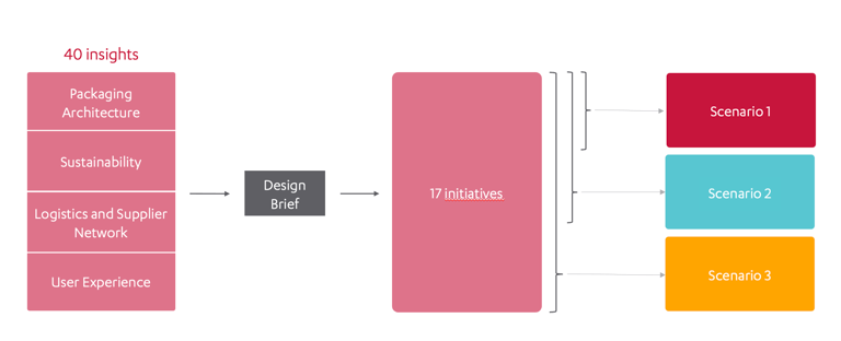 In the first phase of the thesis, we gathered 40 insights across packaging architecture, sustainability, logistics, and user experience.